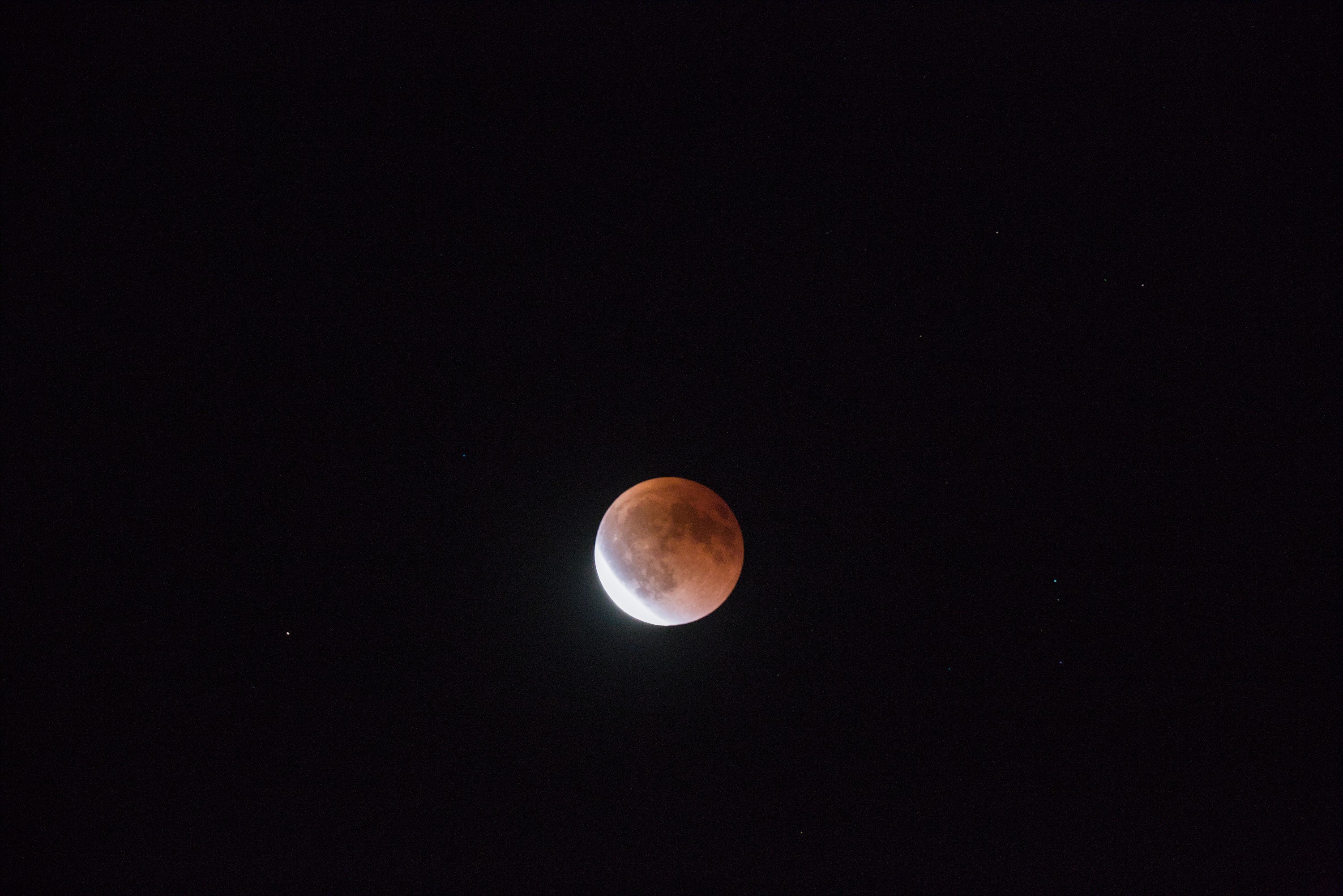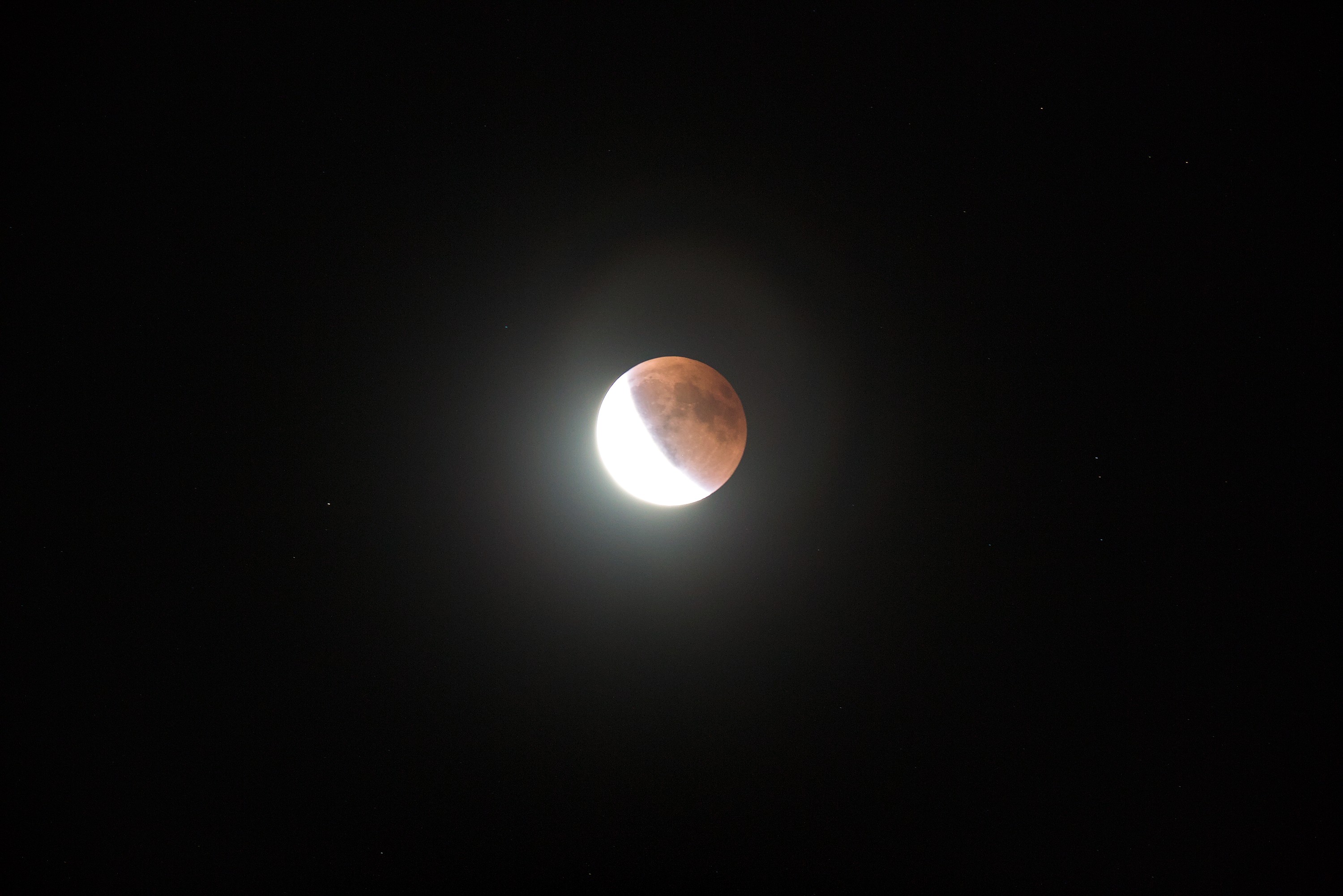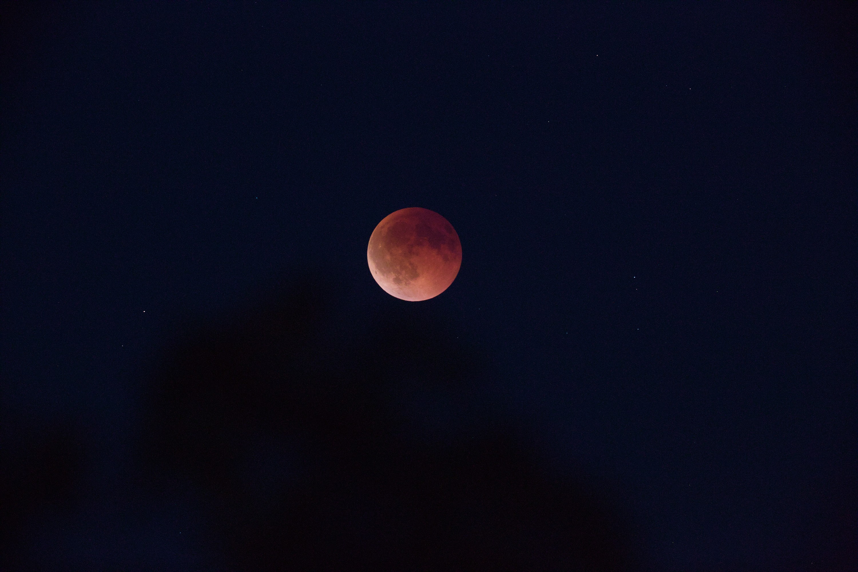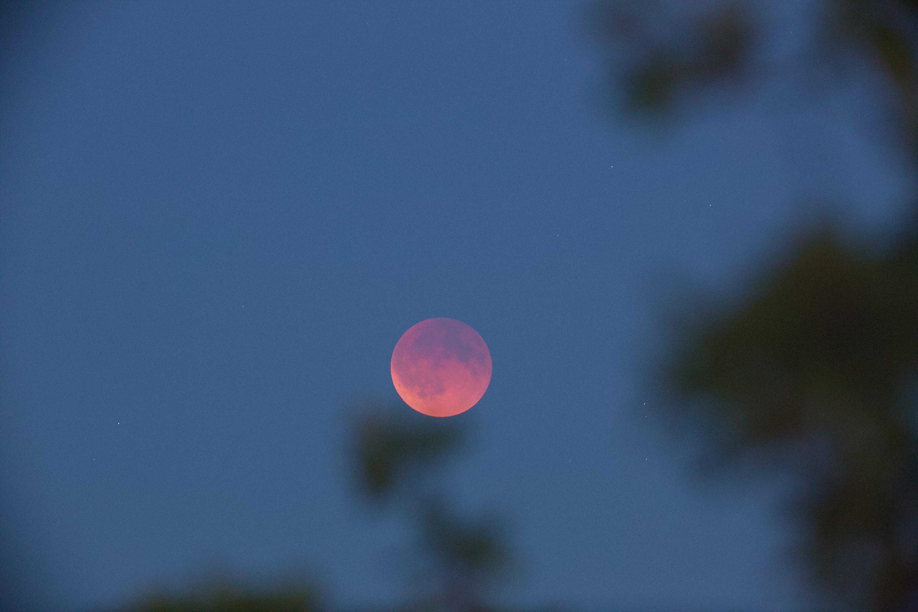 Eigentlich war geplant den verdunkelten Mond direkt neben dem Kirchtum aufzunehmen aber offenbar war die Wolkendecke am Horizont etwas zu dicht, sodass die Mondscheibe erst eine halbe Stunde später hinterm Baum sichtbar wurde.